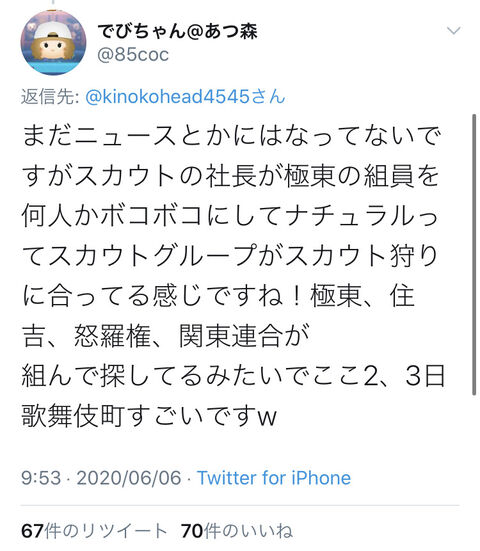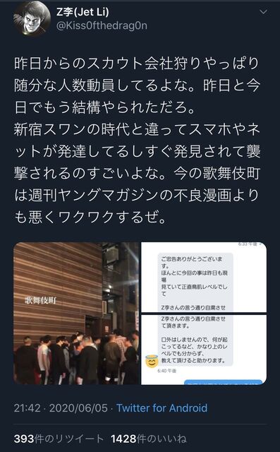 裏で覚醒剤を捌いていたスカウト会社の社長が歌舞伎町を支配してるヤクザをバットでボコったせいで歌舞伎町中のヤクザによるスカウト狩りが行われてる模様