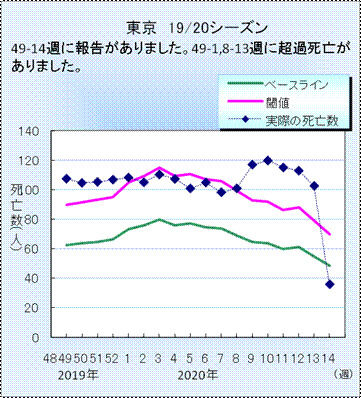 東京特別区(23区)のインフルエンザ・肺炎死亡数。2020年では第8~13週に明らかな「超過死亡」が現れている。第14週で死亡数が急落しているが、これは調査結果がまだ不完全なためと思われる。